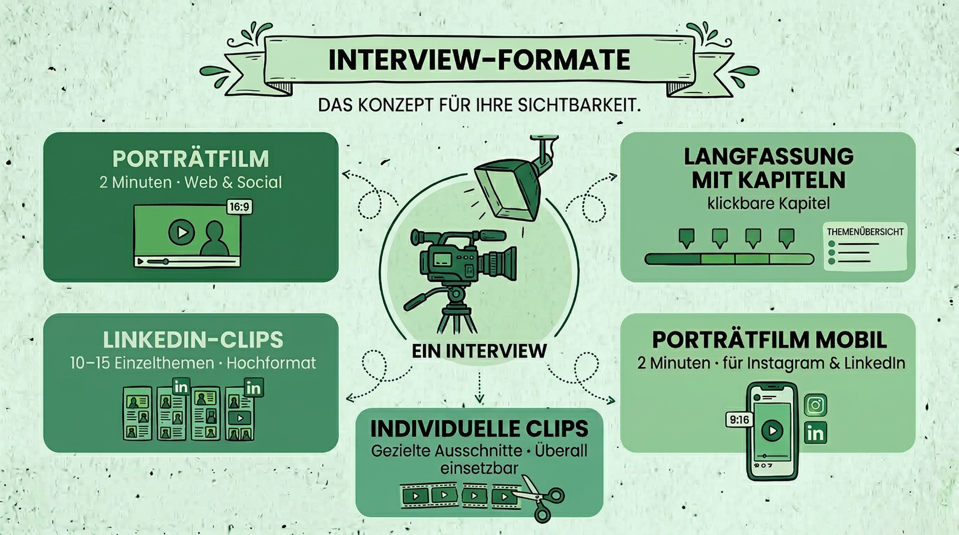 Aus einem einzigen Interview entstehen Formate für jeden Kanal und jeden Bedarf: ein Porträtfilm für die Website, eine Langfassung mit Kapiteln für die Tiefe, Einzelclips für LinkedIn, Hochformat für mobil.
